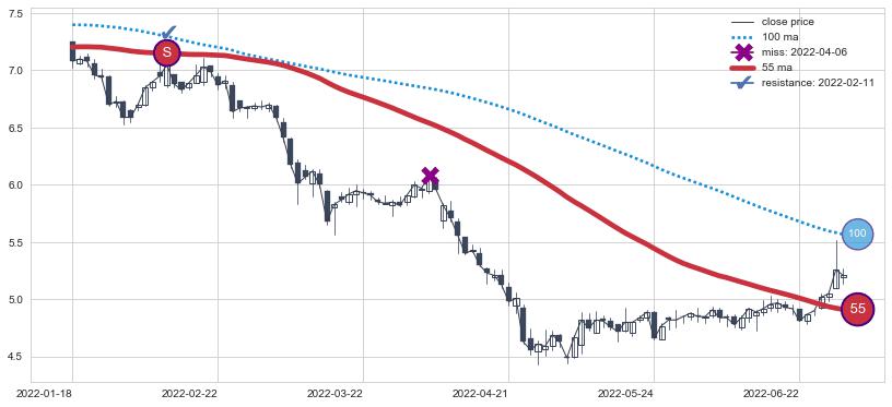 2022-01-18至2022-06-30 慢线与快线呈空头排列, 慢线与快线接触少,无缠绕