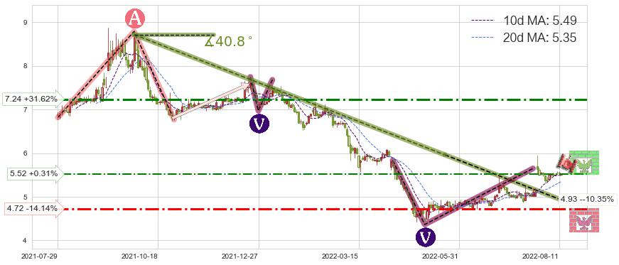 ♘ 阻力价格位7.24,可信任强度64.46%,距离最后交易2022-08-12形成的收盘价格5.50相差 +31.62%