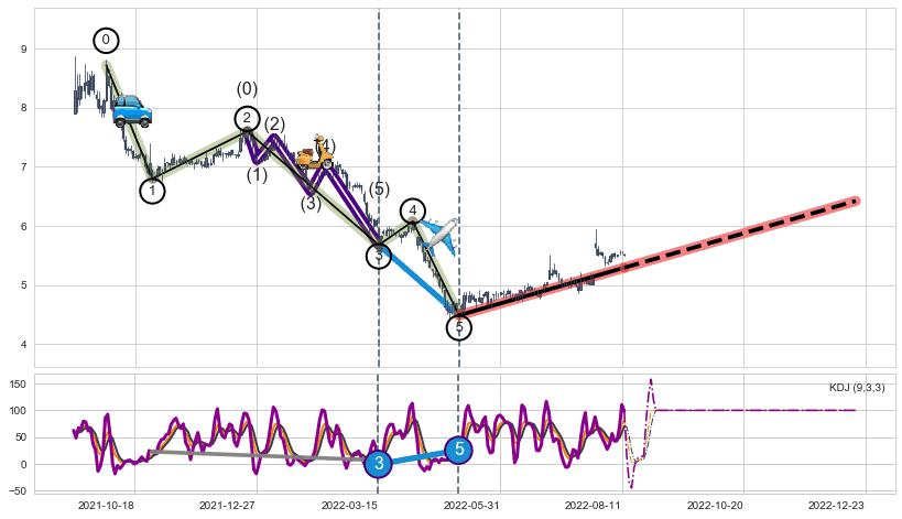 ➣ 第三,五驱动浪端点:【KDJ】走势出现【常规背离 & 反转信号】背离程度28.47%,背离夹角角度83.4˚,背离程度较小