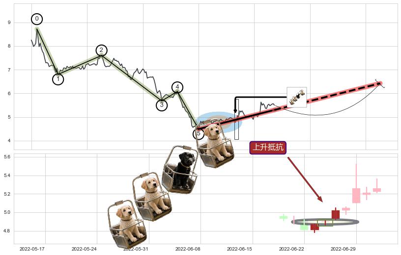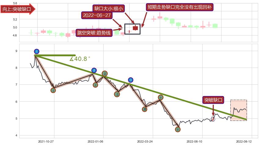 ➣ 2021-09-23-2022-05-20下跌趋势存在反转上涨[机会],其原下跌趋势的阻力位(4.93)已被突破[强支撑信号],原下跌趋势角度: 40.8˚