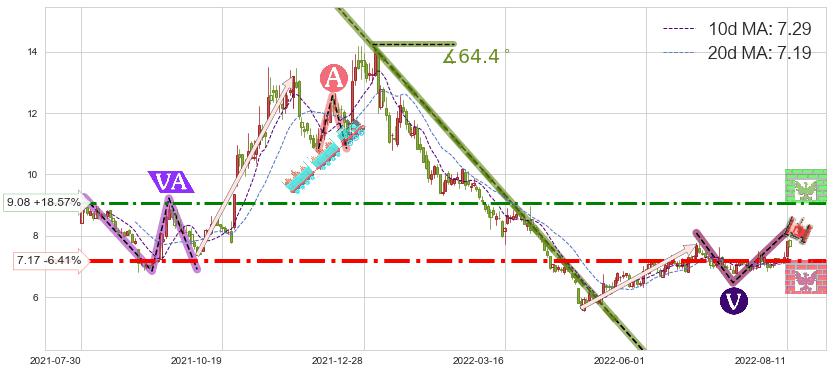 ♘ 支撑价格位7.17,可信任强度75.18%,距离最后交易2022-08-12形成的收盘价格7.66相差 -6.41%