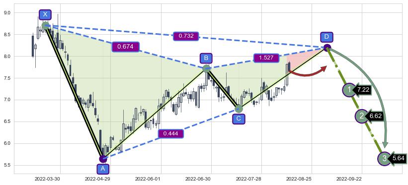 ➣ D点拟合预测价格8.20,距离最后交易收盘价格7.66相差 +6.99%