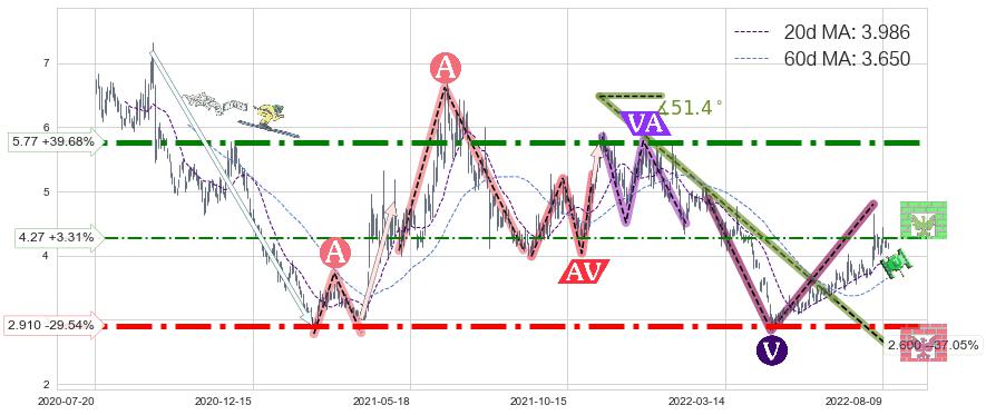 ♘ 阻力价格位4.27,可信任强度44.74%,距离最后交易2022-08-12形成的收盘价格4.13相差 +3.31%