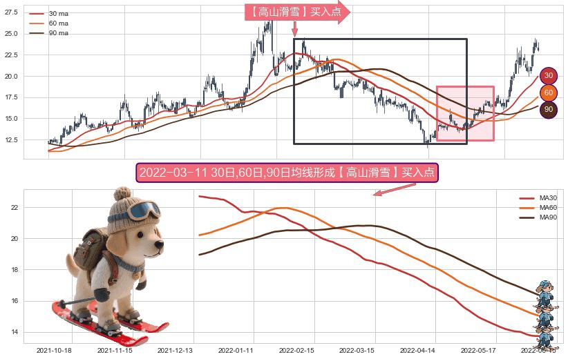 ⚀ 2021-12-15日-2022-06-07日显现 30日-60日-90日均线 【高山滑雪】买入点 看多信号,后市看涨,买入