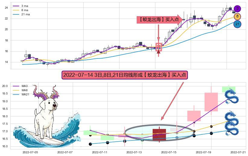 ⚀ 2022-07-14日显现 3日-8日-21日均线 【蛟龙出海】买入点 看多信号,后市看涨,买入