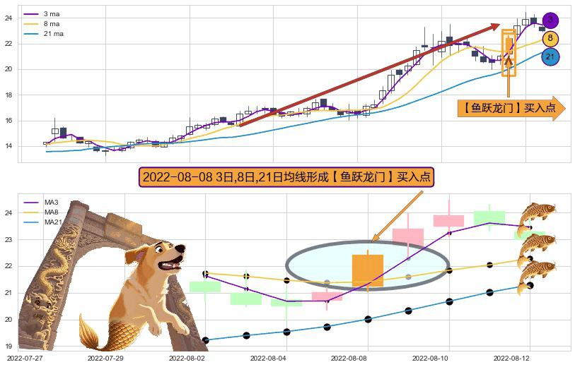 ⚀ 2022-08-08日显现 3日-8日-21日均线 【鱼跃龙门】买入点 看多信号,后市看涨,买入