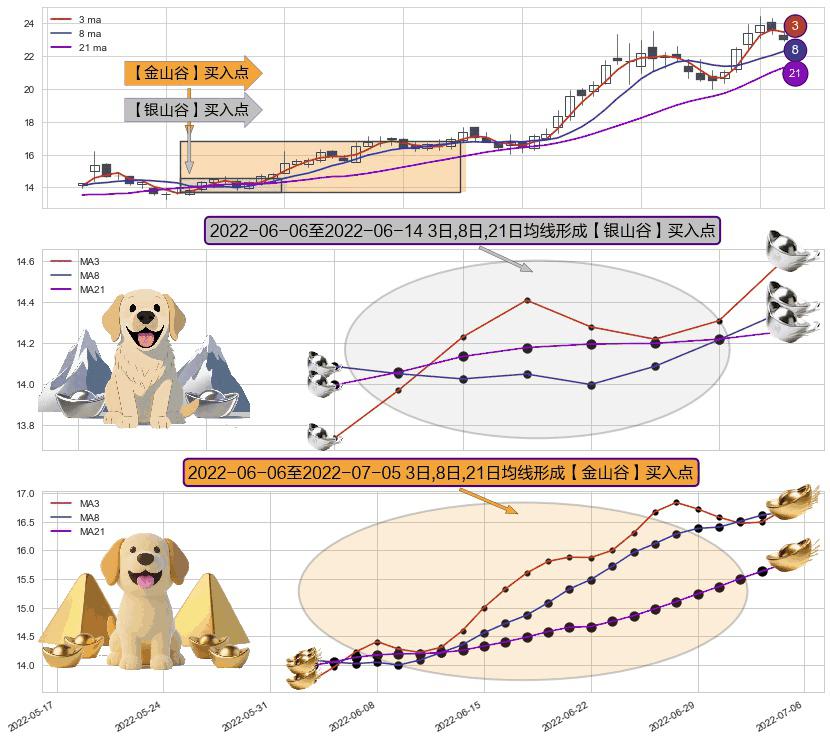 ⚂ 2022-06-07-日至2022-07-05-日显现 3日-8日-21日均线 【金山谷】买入点 其再次确认了买入信号,可靠性更强,买入