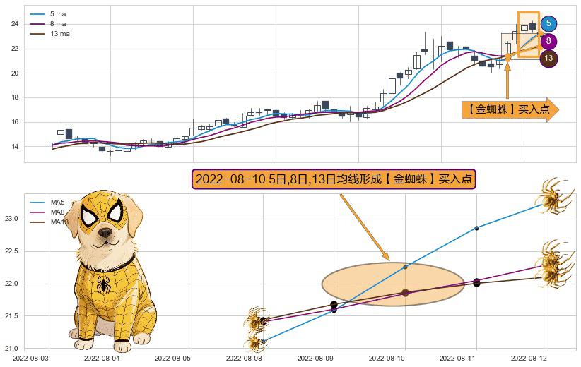 ⚀ 2022-08-10日显现 5日-8日-13日均线 【金蜘蛛】买入点 看多信号,后市看涨,买入