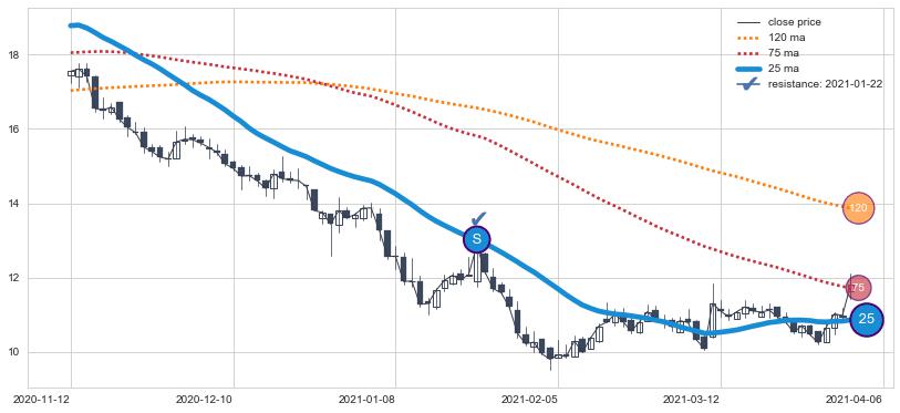 ⚂ 2022-07-14日突然冒出一根大阳线,一下子顶穿三条均线且收盘价收在各条均线之上