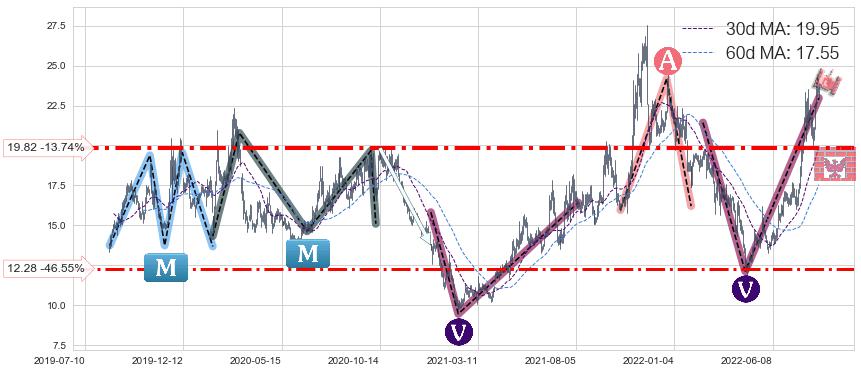 ♘ 支撑价格位19.82,可信任强度79.14%,距离最后交易2022-08-12形成的收盘价格22.98相差 -13.74%