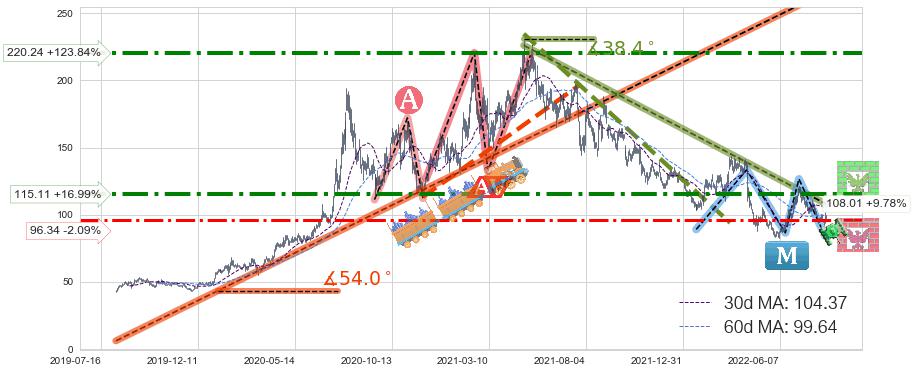 ♘ 阻力价格位115.11,可信任强度82.86%,距离最后交易2022-08-12形成的收盘价格98.39相差 +16.99%