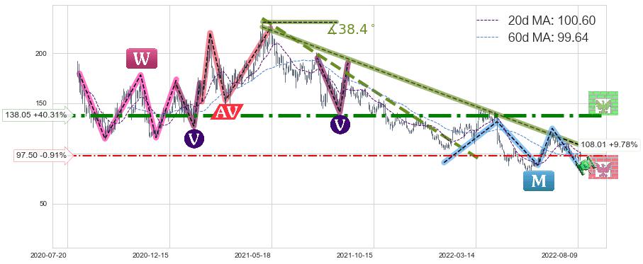 ♘ 阻力价格位138.05,可信任强度91.35%,距离最后交易2022-08-12形成的收盘价格98.39相差 +40.31%
