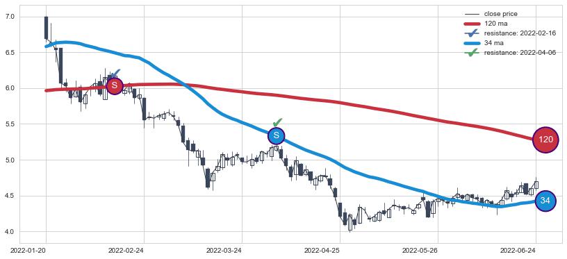 下跌趋势2022-01-20-2022-06-24,均线120, 34确认关键阻力2处