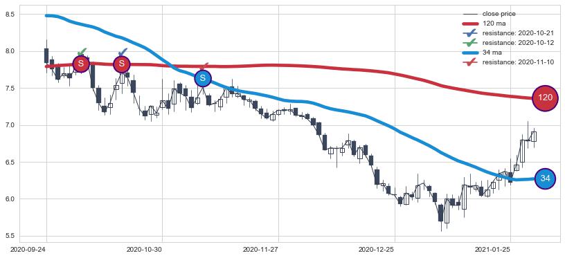 下跌趋势2020-09-24-2021-01-29,均线120, 34确认关键阻力3处