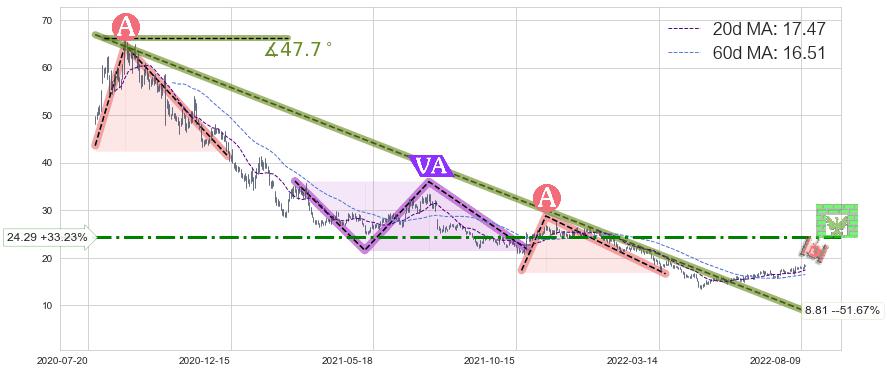 ♘ 阻力价格位24.29,可信任强度56.89%,距离最后交易2022-08-12形成的收盘价格18.23相差 +33.23%