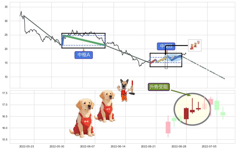 ➣ 【中枢B】:2022-05-24-2022-08-01,中枢由6笔构成,共49交易日, ZG=16.06, ZD=15.93