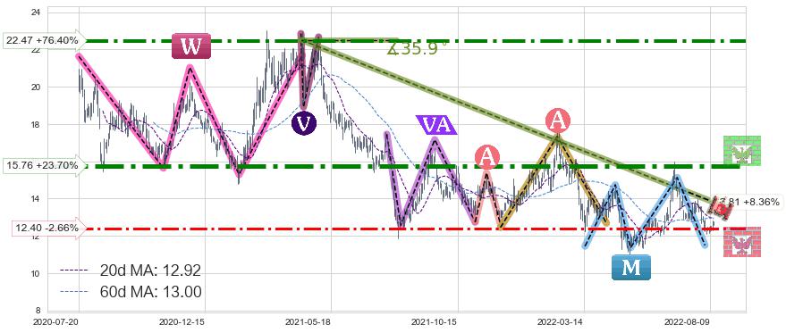 ♘ 阻力价格位22.47,可信任强度75.41%,距离最后交易2022-08-12形成的收盘价格12.74相差 +76.40%