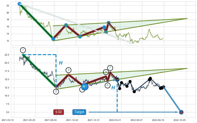 ➢ 最小中继整理跌幅→𝐇: 9.92 (𝐇楔型旗杆的长度:楔型起点→顶点)
