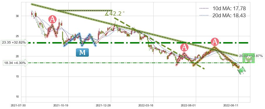 ♘ 阻力价格位23.35,可信任强度91.93%,距离最后交易2022-08-12形成的收盘价格17.58相差 +32.82%