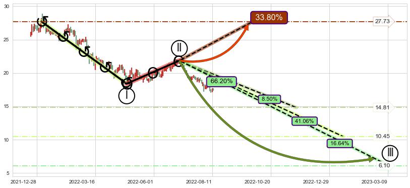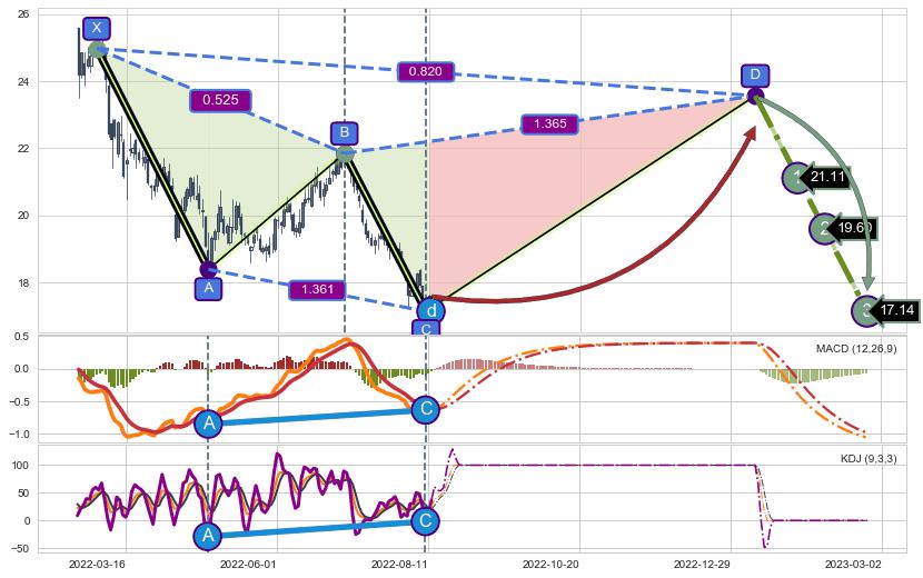 ➣ D点拟合预测价格23.57,距离最后交易收盘价格17.58相差 +34.07%
