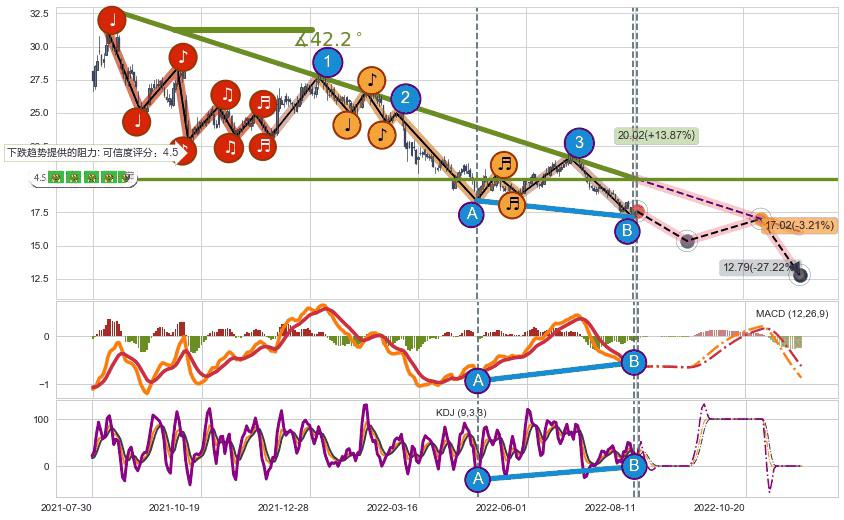 ➣ 预测:2022-11-01,【试探阻力】稳定目前下跌趋势的前提下,预测价格:17.02