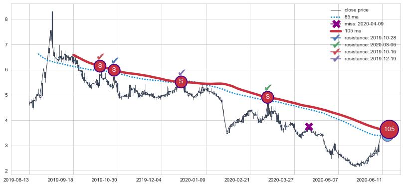 下跌趋势2019-08-13-2020-06-11,均线105确认关键阻力4处