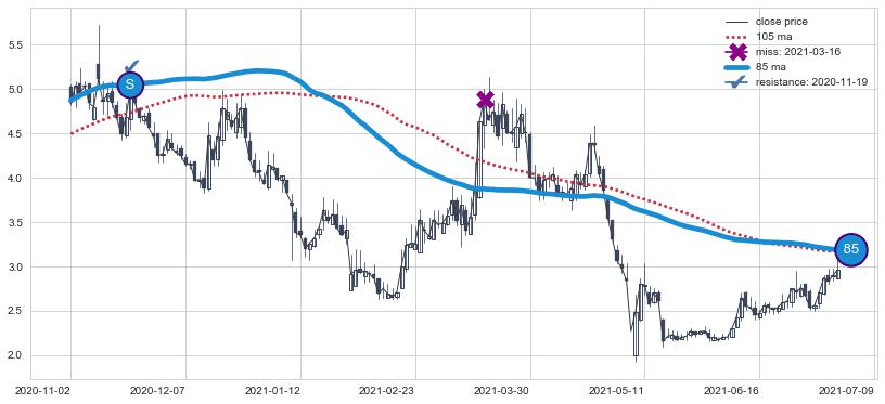 下跌趋势2021-10-20-2022-06-21,均线105, 85确认关键阻力2处