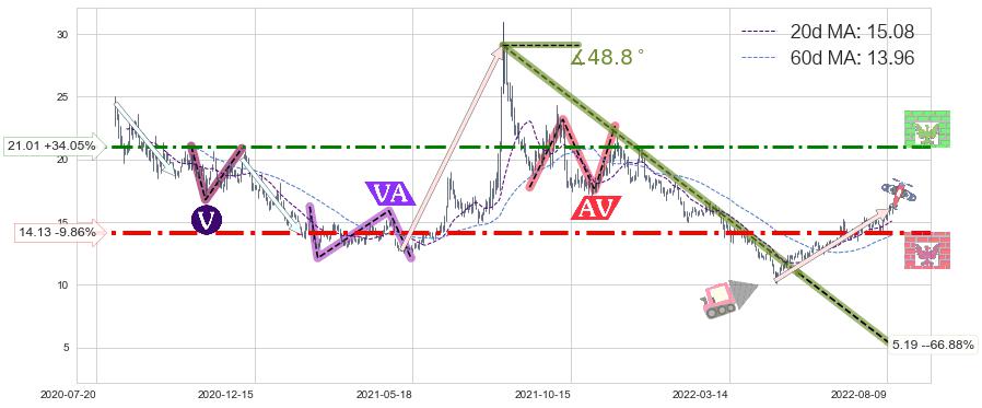 ♘ 阻力价格位21.01,可信任强度66.53%,距离最后交易2022-08-12形成的收盘价格15.67相差 +34.05%