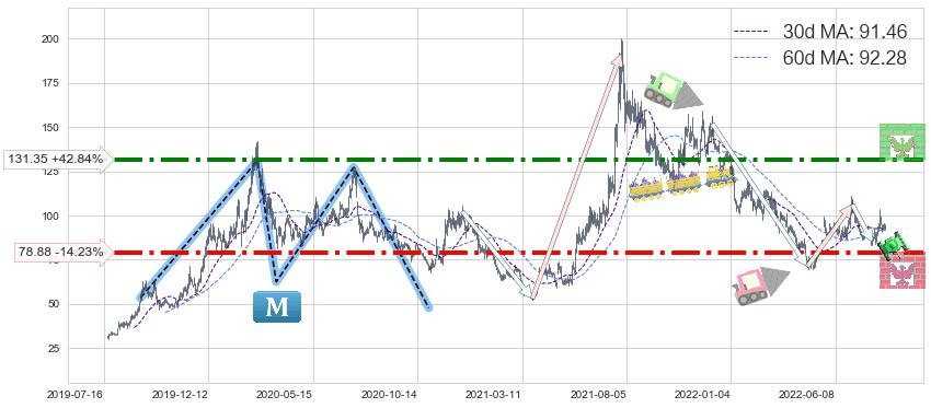 ♘ 支撑价格位78.88,可信任强度78.10%,距离最后交易2022-08-12形成的收盘价格91.96相差 -14.23%