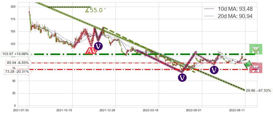 ♘ 阻力价格位103.97,可信任强度88.70%,距离最后交易2022-08-12形成的收盘价格91.96相差 +13.06%