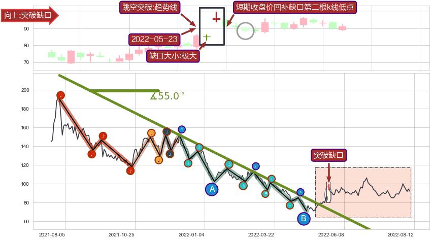 从2021-07-30至2022-05-20,共包含193个交易日,阶段股价下跌-67.76%,阶段股价变动位移路程比: 1 : 7,下跌趋势角度: 55.0