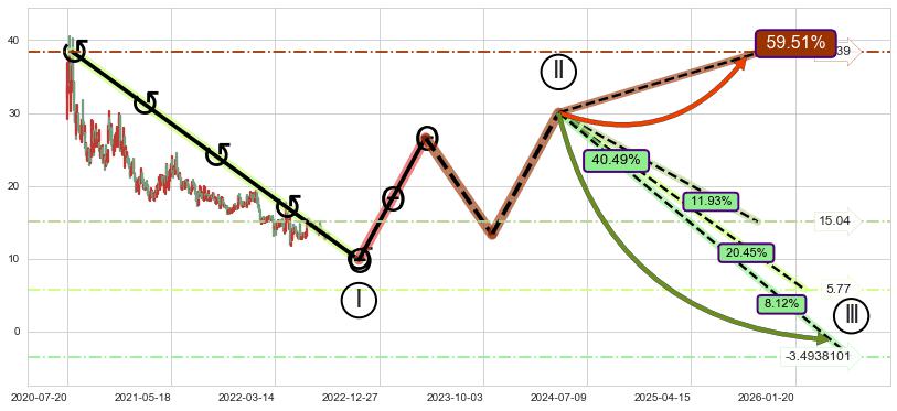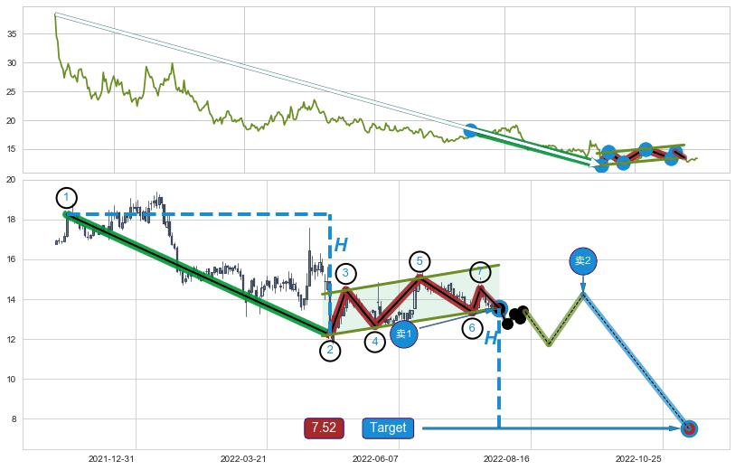 ➣ D点拟合预测价格18.42,距离最后交易收盘价格13.38相差 +37.68%