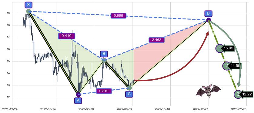 ➣ 未完成【蝙蝠】形态起点X: 2022-01-14, 已到达C点: 2022-08-03, 预测最终D点: 2022-12-27, 共236交易日