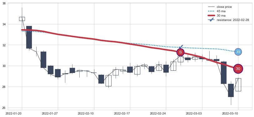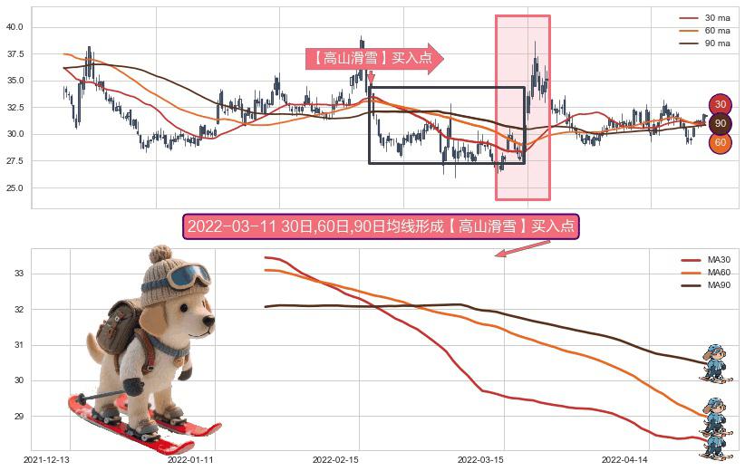 ⚀ 2022-01-20日-2022-04-26日显现 30日-60日-90日均线 【高山滑雪】买入点 看多信号,后市看涨,买入