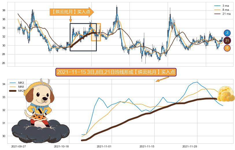 ⚀ 2021-10-21日-2021-12-07日显现 3日-8日-21日均线 【烘云托月】买入点 看多信号,后市看涨,买入