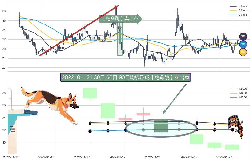 ⚀ 2022-01-21日显现 30日-60日-90日均线 【绝命跳】卖出点 看空信号,后市看跌,卖出