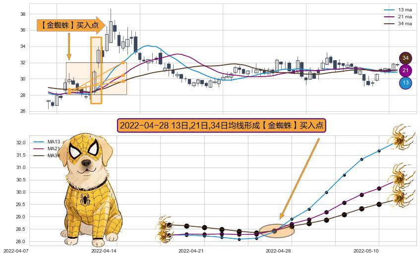 ⚀ 2022-04-28日显现 13日-21日-34日均线 【金蜘蛛】买入点 看多信号,后市看涨,买入