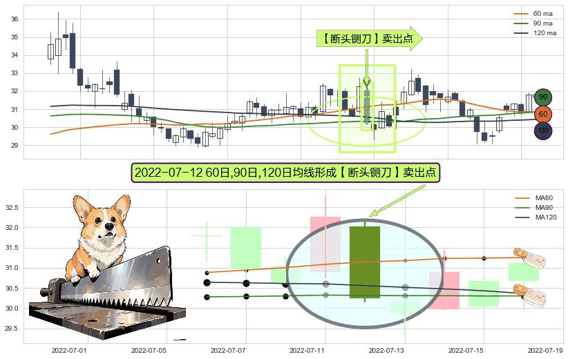 ⚀ 2022-07-12日显现 60日-90日-120日均线 【断头铡刀】卖出点 看空信号,后市看跌,卖出