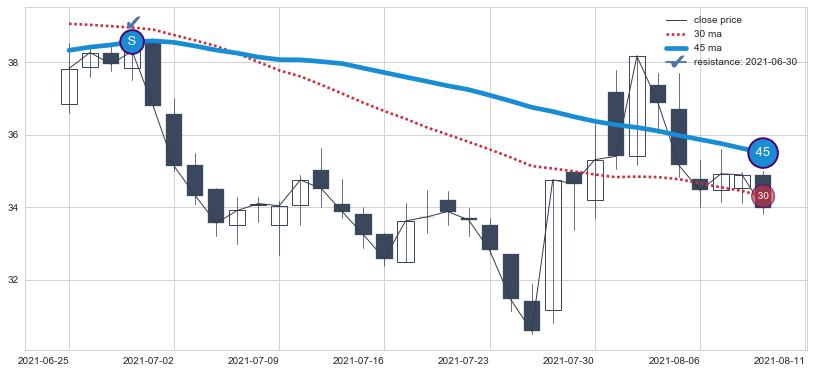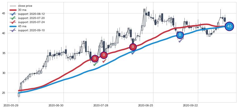 ⚁ MA3和MA8走势平行,且始终保持在短距离内,MA21始终在短中期均线下方,与短中期均线保持一定的距离,微微上行