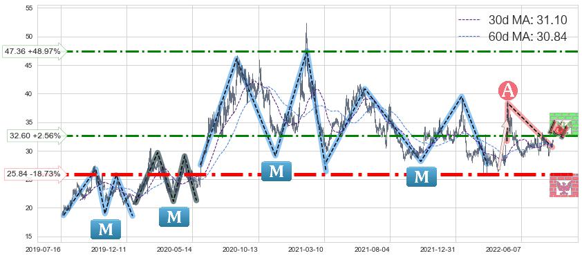 ♘ 阻力价格位32.60,可信任强度61.18%,距离最后交易2022-08-12形成的收盘价格31.79相差 +2.56%