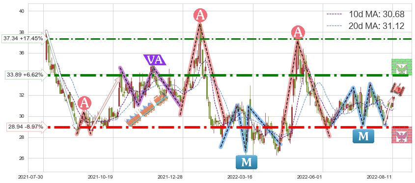 ♘ 阻力价格位33.89,可信任强度90.48%,距离最后交易2022-08-12形成的收盘价格31.79相差 +6.62%