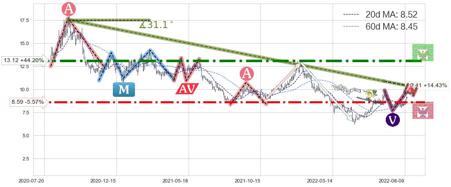 ♘ 阻力价格位13.12,可信任强度97.75%,距离最后交易2022-08-12形成的收盘价格9.10相差 +44.20%