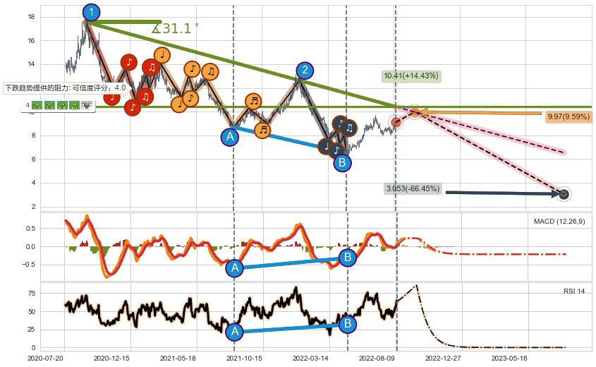 ➣ D点拟合预测价格17.39,距离最后交易收盘价格9.10相差 +91.12%