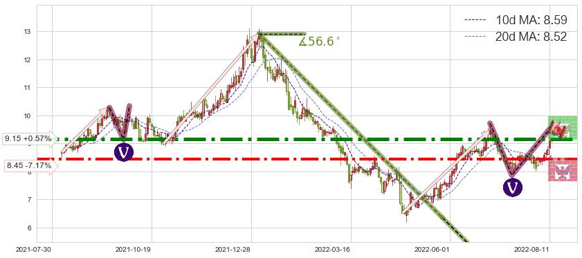 ♘ 阻力价格位9.15,可信任强度90.06%,距离最后交易2022-08-12形成的收盘价格9.10相差 +0.57%