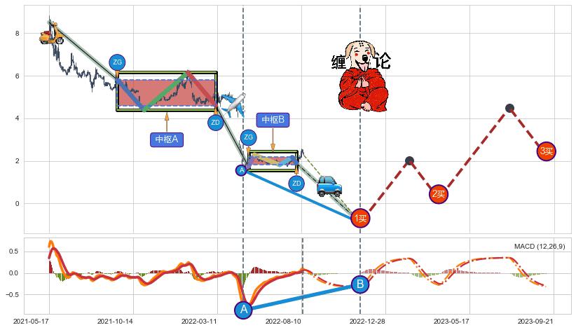| 9 🅚:下跌两颗星 | 下跌三颗星 ➕ ☯️:缠论中枢点下降缠中枢B破位后距离1买距离较远,随后猜想后续持续下跌(趋势跟踪) ☞ 看空信号 ⇥ 【🅚线】交织【图形】⇥ 综合量化分数: 47 | > |