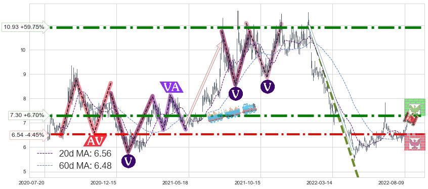 ♘ 阻力价格位7.30,可信任强度86.75%,距离最后交易2022-08-12形成的收盘价格6.84相差 +6.70%
