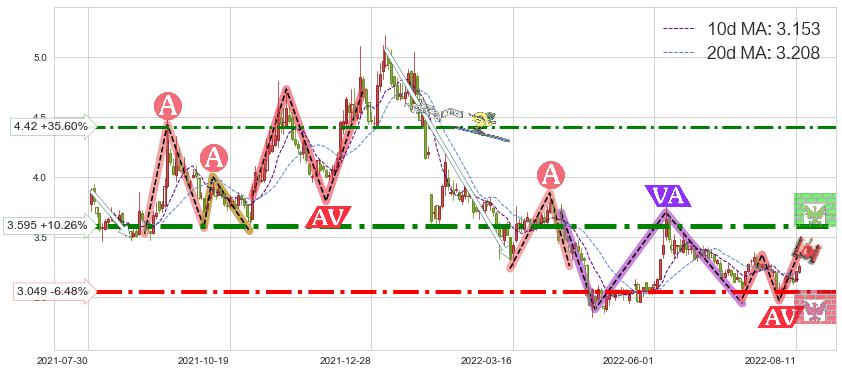 ♘ 阻力价格位3.595,可信任强度90.91%,距离最后交易2022-08-12形成的收盘价格3.260相差 +10.26%