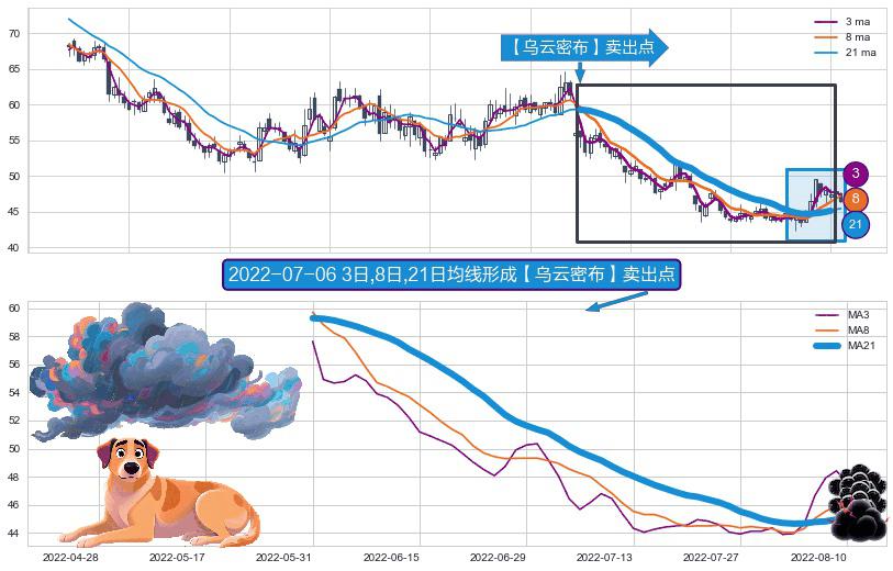 ⚀ 2022-05-31日-2022-08-10日显现 3日-8日-21日均线 【乌云密布】卖出点 看空信号,后市看跌,卖出