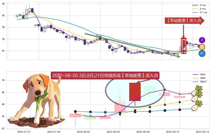 ⚀ 2022-08-05日显现 3日-8日-21日均线 【旱地拔葱】买入点 看多信号,后市看涨,买入