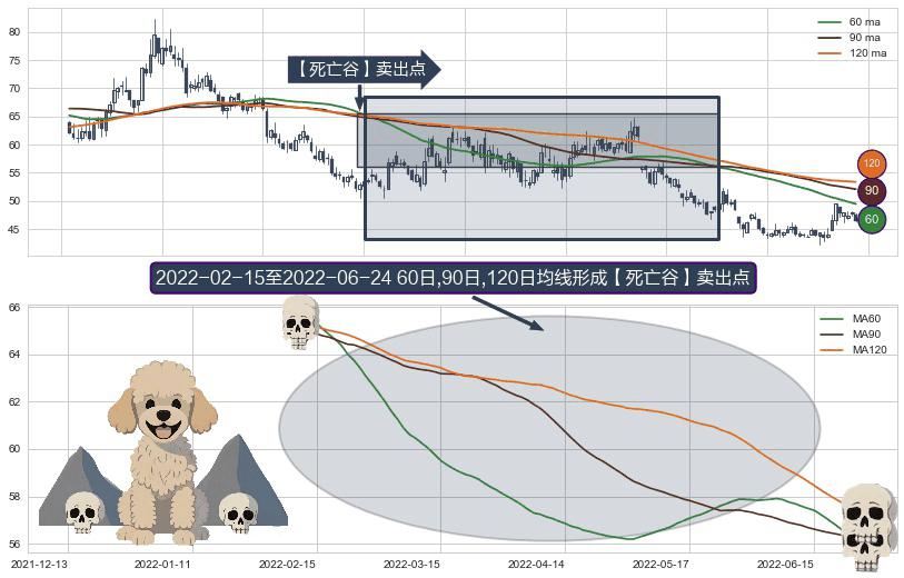 ⚀ 2022-02-16-日至2022-06-24-日显现 60日-90日-120日均线 【死亡谷】卖出点 看空信号,后市看跌,卖出